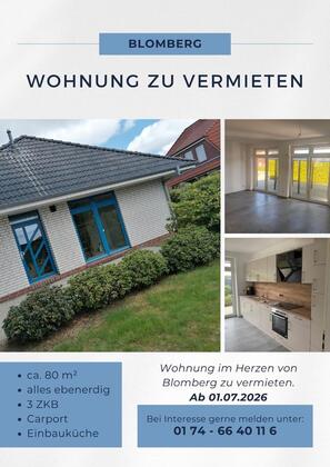 Wir bieten eine Erdgeschosswohnung im schönen Ostfriesland im Zentrum von Blomberg an. Der Bungalow ist ab Juli 2026 verfügbar.